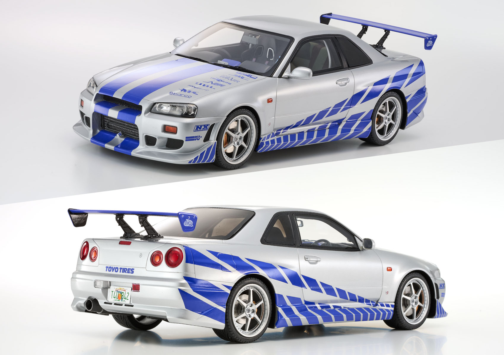 The Nissan Skyline GT-R (R34), which appeared in 2 Fast 2 Furious as Brian O'Conner's car, has been modeled as a 1/12 scale resin model. In addition to the iconic blue vinyl graphics on the silver body, the model faithfully reproduces the C-West front bumper, side steps, and rear wing, as well as the HRE aluminum wheels, interior roll cage, and NOS tanks.