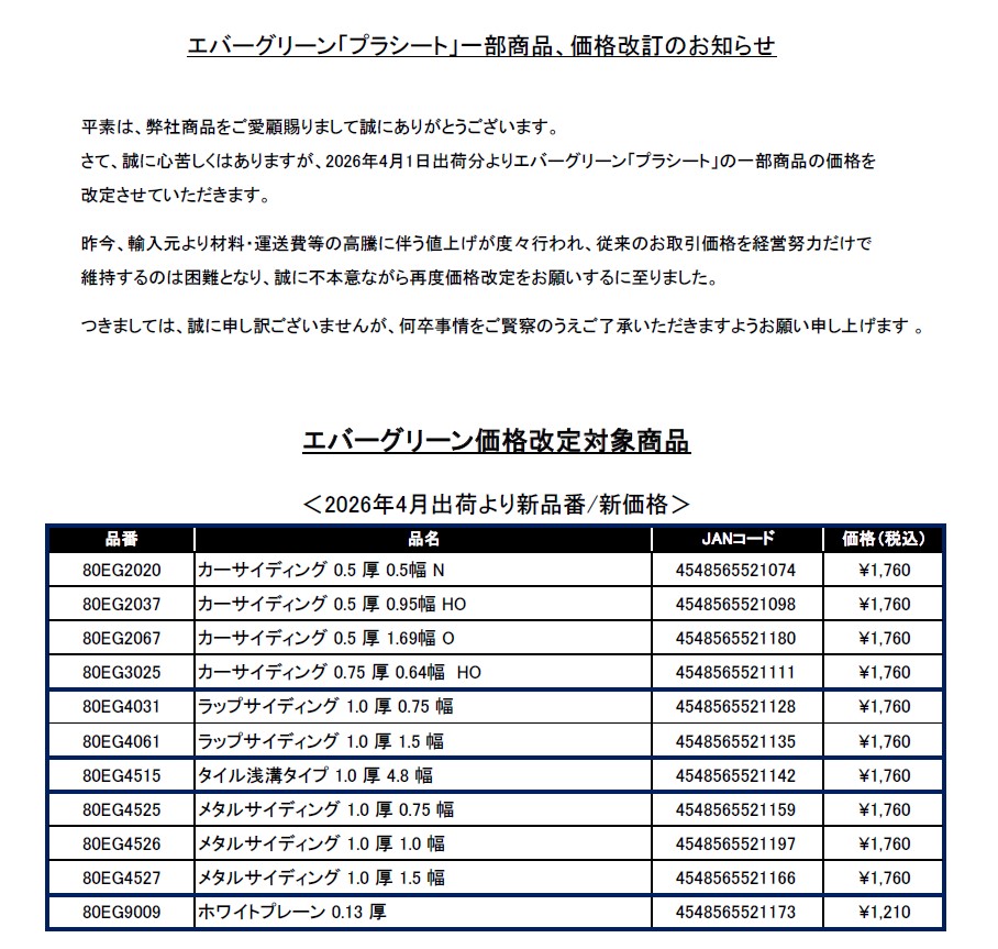 エバーグリーン「プラシート」一部商品、価格改訂のお知らせ