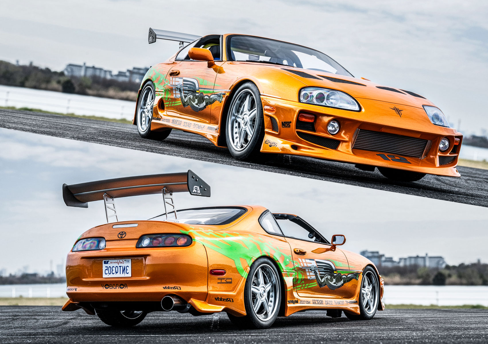 映画『ワイルド・スピード』のブライアン・オコナーの愛車、「トヨタ スープラ」を1/12スケールでレジンモデル化。特徴的なボディカラーのキャンディオレンジパールペイントと側面のモチーフも再現。リアウイングやフロントスポイラー、サイドスカート、ホイールなども忠実に再現されている。